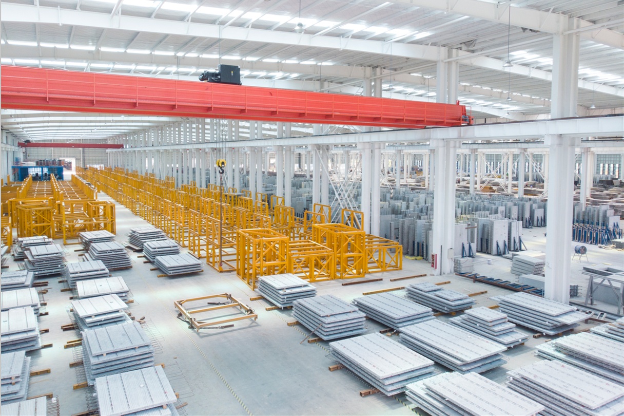 金鹏绿色建筑产业集团是苏皖地区最大的装配式建筑单体工厂,拥有搅拌站、钢筋加工线、墙板流水线、叠合板流水线、异形件生产线、楼梯生产线以及PK3型板??榛悄芰魉叩?5条智能化生产线,综合年产能可达30万m3。