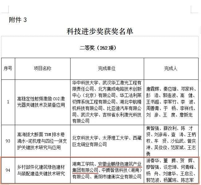 近日,2025年度中国商业联合会科学技术奖评选结果正式公布,授予奖项包括科技成就奖、技术发明奖、科技进步奖和科技创新人物奖四大类别。金鹏与湖南工学院等单位合作完成的“乡村部件化建筑绿色建材与装配建造关键技术研究”项目荣获科技进步奖二等奖。